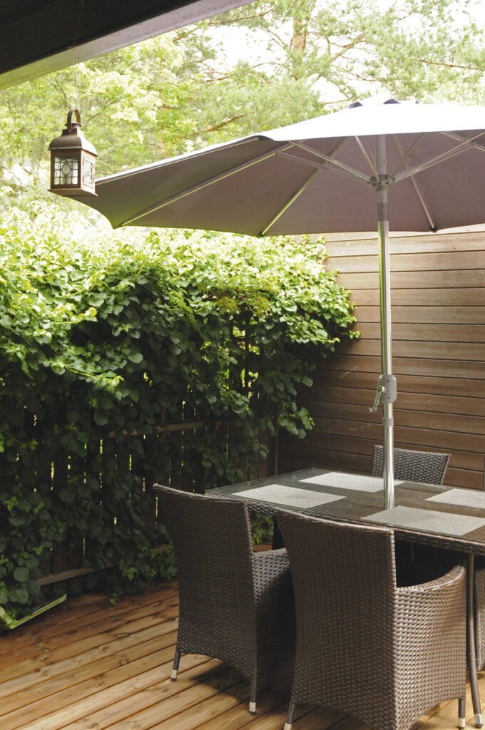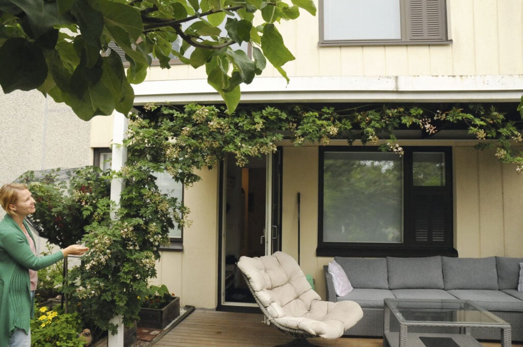 – Lämpötila nousee helposti yli kolmenkymmenen aurinkoisena päivänä. Nurmikko kulottui aina, paitsi hyvin sateisina kesinä. Mietimmekin nurmen poistamista pitkään, kunnes muutama vuosi sitten toteutimme haaveen suuresta terassista. Emme ole katuneet, muutos kannatti.