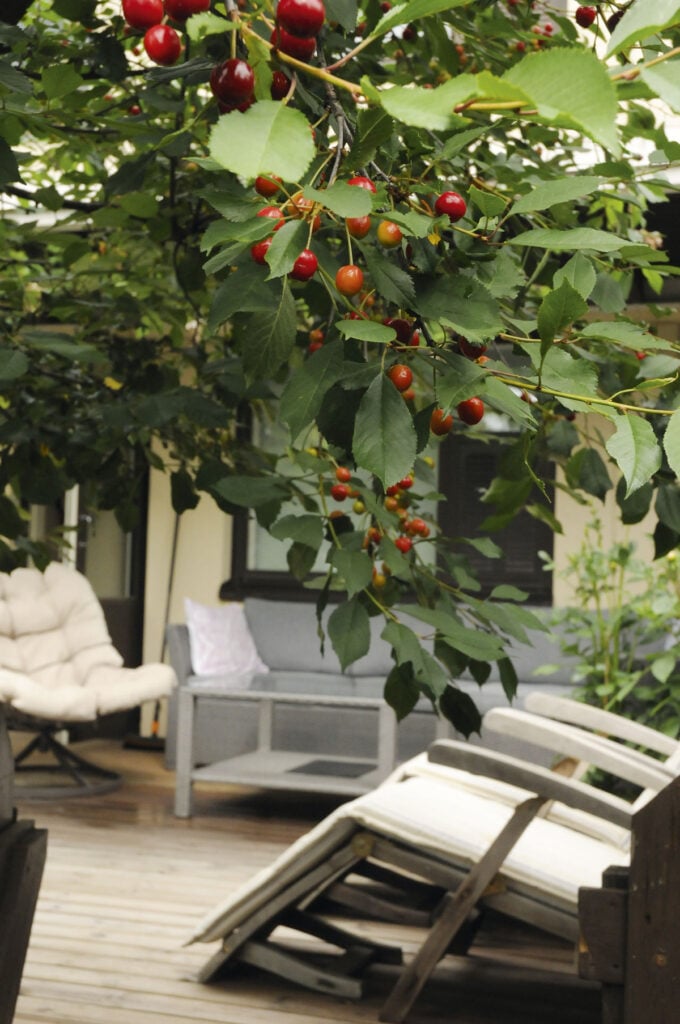 Takapiha antaa suoraan etelään ja on suojassa tuulelta – eli se on erittäin kuuma.