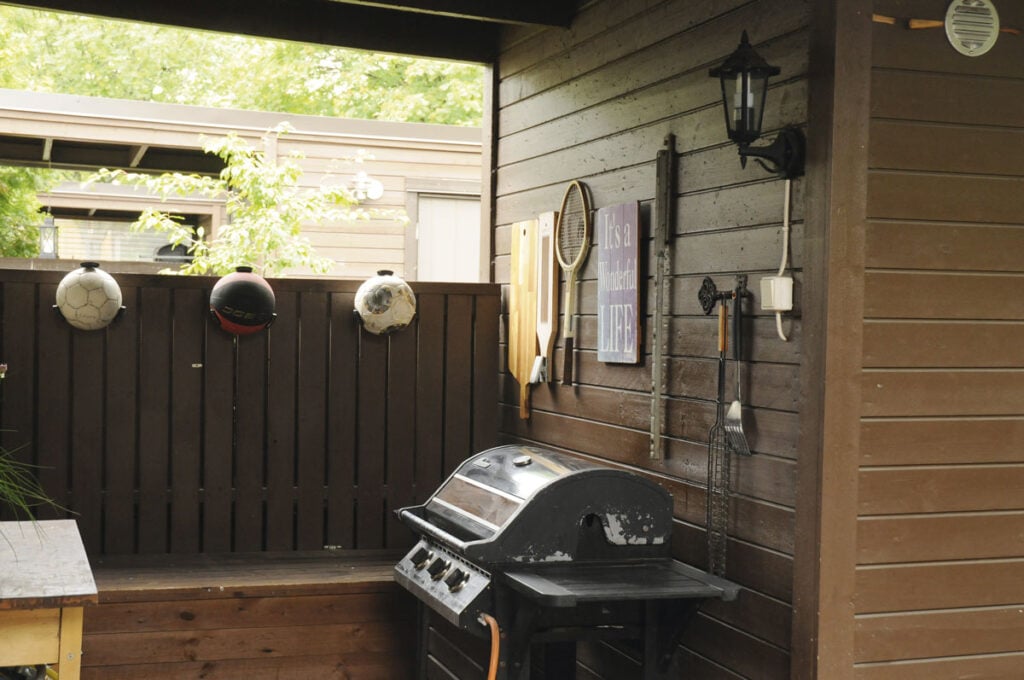 Etupiha on kerrosta ylempänä katutasossa. Sieltä löytyy miehen valtakunta eli grilli suojaisan katoksen alta talon ja pihavaraston välistä.