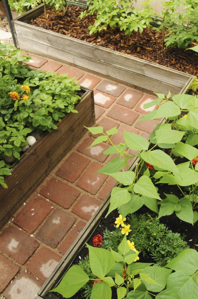 Satoa tuottavat myös talon seinustalle rakennetut pitkät viljelylaatikot. Niissä viihtyvät muun muassa pavut (Phaseolus), samettikukat (Tagetes) ja tarhapensasmustikat (Vaccinium Angustifolium-Ryhmä).