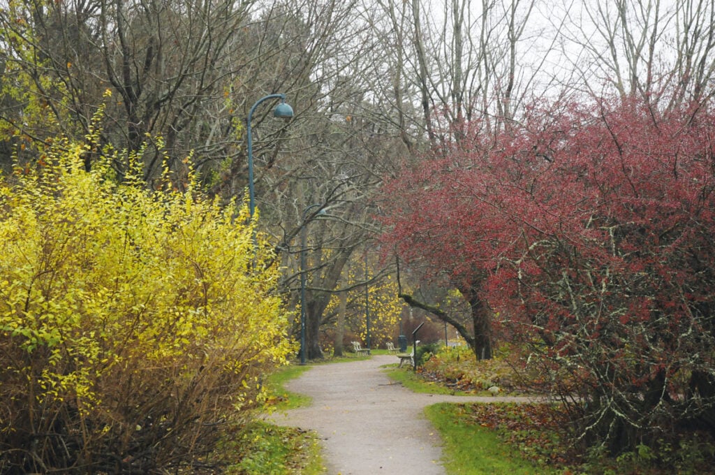 Loka–marraskuisella kävelyllä on paljon ihasteltavaa. Marjaomenapensaan pienet marjat värjäävät koko pensaan punaiseksi. Lehtikuusen pehmeät neulaset tulevat ruskaan vasta kun lehtipuut ovat jo lehdettömiä. Pörröiset, kananpojankeltaiset lehtikuusihahmot pilkottavat paljaiden puiden väleistä ja takaa. Tuoksumaailma hämmästyttää, kun katsurat ja taikapähkinät tuoksuvat makealta, sitruunaltakin.