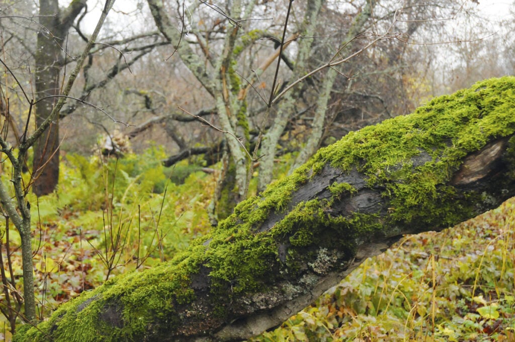 Sammal hohtaa smaragdinvihreänä kallistuneen puun rungolla. Aluskasvillisuuden tärkeää virkaa hoitavat kotkansiivet ovat vielä vihreinä, varjohiippojen väritys on muuttumassa ruskaan, kärhö pehmeine siemenhapsuineen kiipeää puolivillisti pensaan oksistoon. Perennapenkeissä kukkivat maksaruohot.