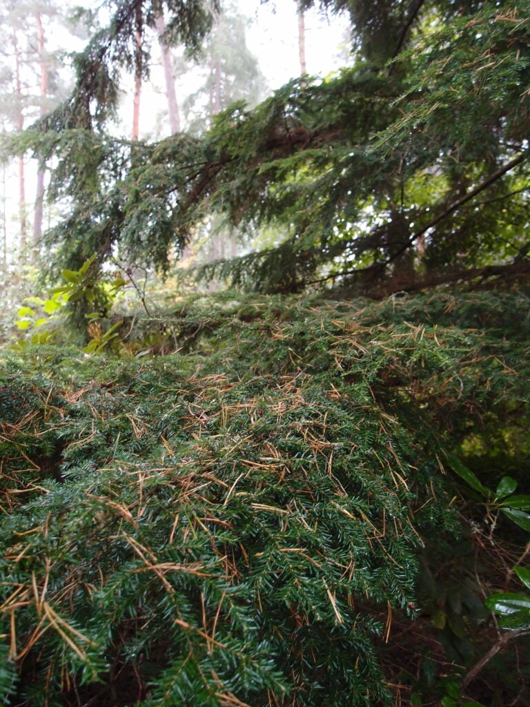 Suurten hemlokkien hämyssä voi katsella, millaisiksi puut kehittyvät varttuessaan.