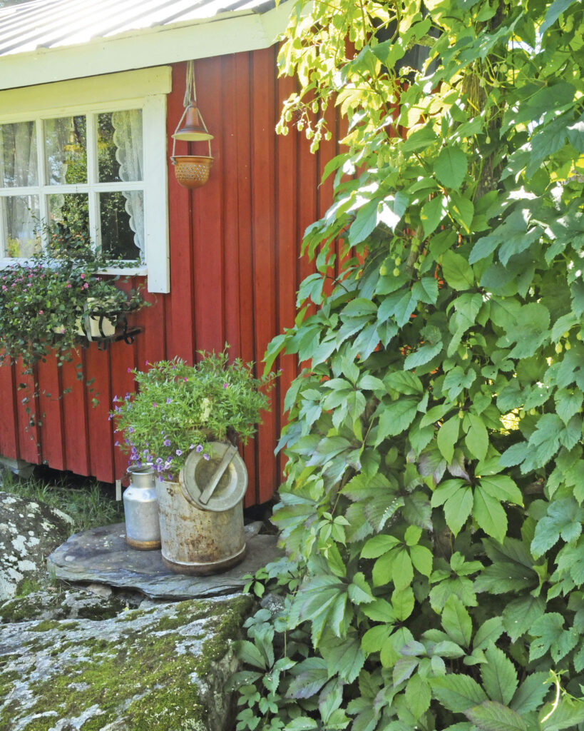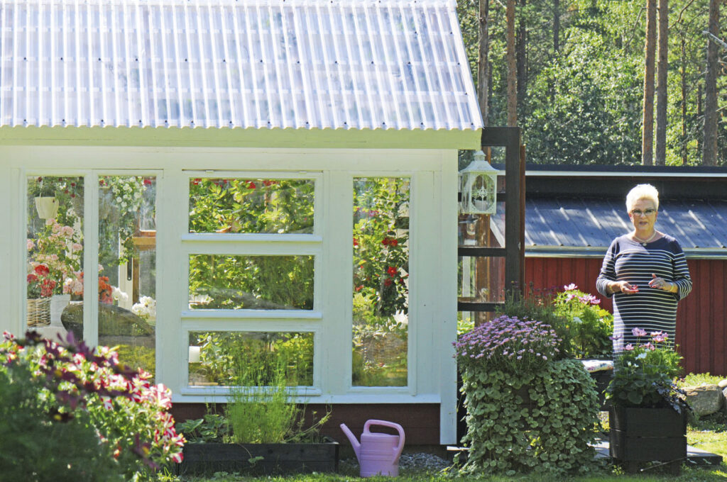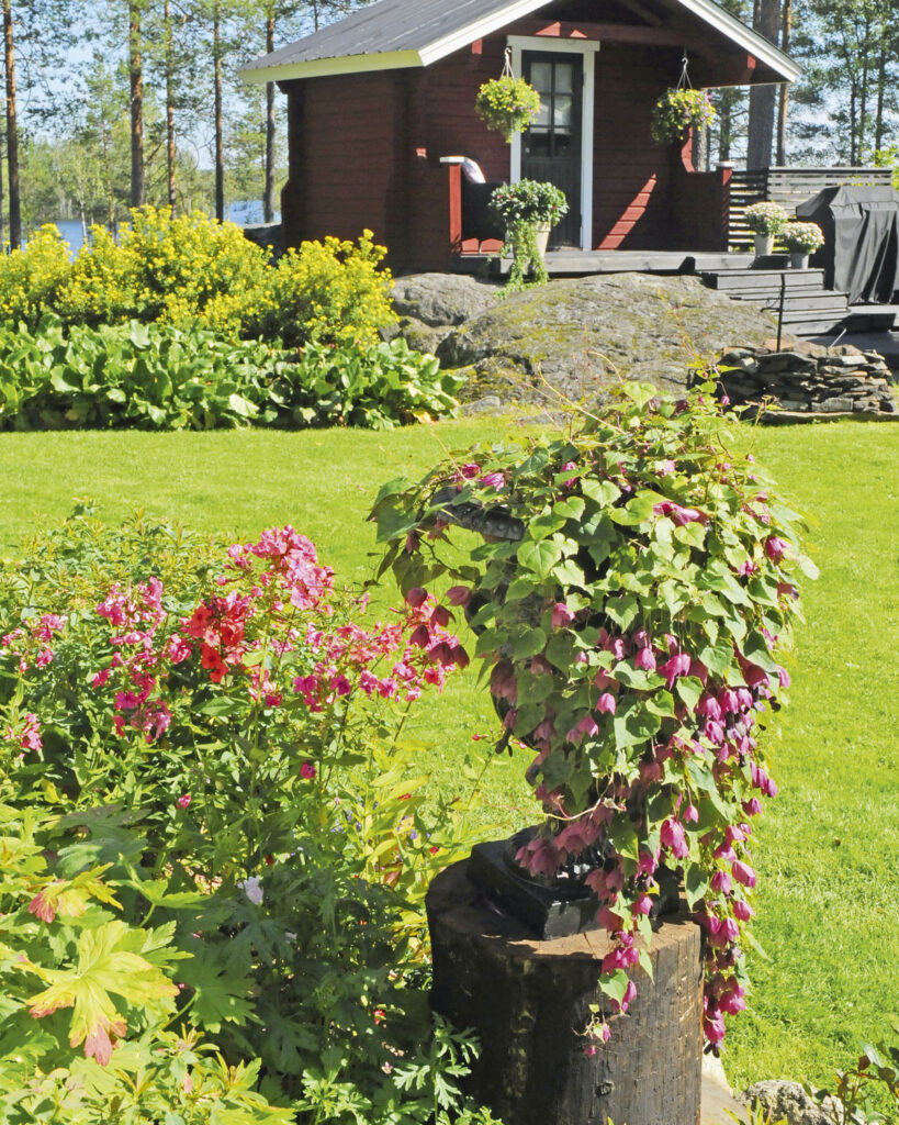 Viime vuonna Helli löysi ensimmäistä kertaa mårbackapelargoneja paikallisesta liikkeestä, kuten myös raikkaan punavalkoraidallisen petunian, jonka hän risti Marianneksi. Kesäkukat hän ostaa valmiina, sillä taimikasvatuksia ei kyytiin mahdu, kun mökille keväällä lähdetään.