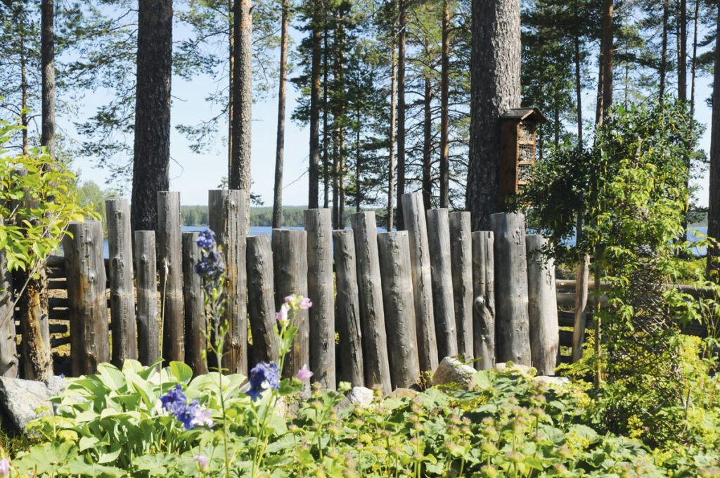 Kelopuuaita suojaa istutuksia järveltä puhaltavilta tuulilta ja sointuu maisemaan. Ukonhatut (Aconitum) ja jaloangervot (Astilbe) viihtyvät kainuulaisella pihalla.