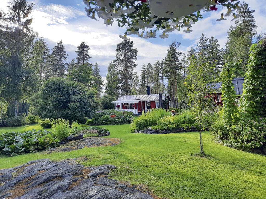 – Tässä pihassa toimii kolme kovaa koota: kelo, kivi ja kallio. Terasseja tai rakennettuja polkuja ei meillä ole – liian tehdyt, modernit jutut eivät sovi tänne metsän keskelle.