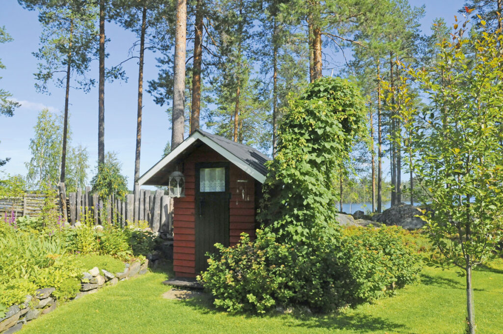 Huussi oli alun perin kuusikossa, nyt osana pihapiiriä. Humalat (Humulus lupulus) kasvavat hyvin ja luotettavasti.
