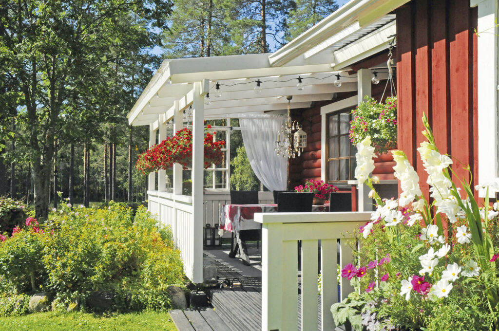 – Se on meidän punaisen maton kohta. Saatetaan istua siinä isommallakin porukalla, osa mahtuu olemaan portailla. Näkyy koko pihapiiri, ja ilta-aurinko paistaa mukavasti.