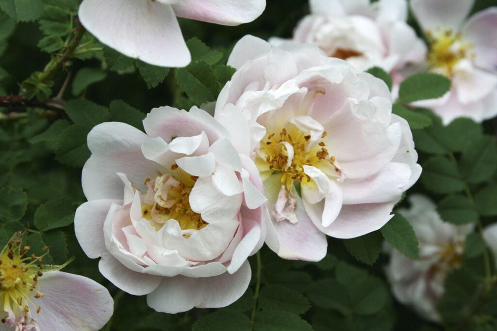 Ruusutarhassa kukkii kesäkuussa muun muassa papulanruusu (Rosa 'Papula').