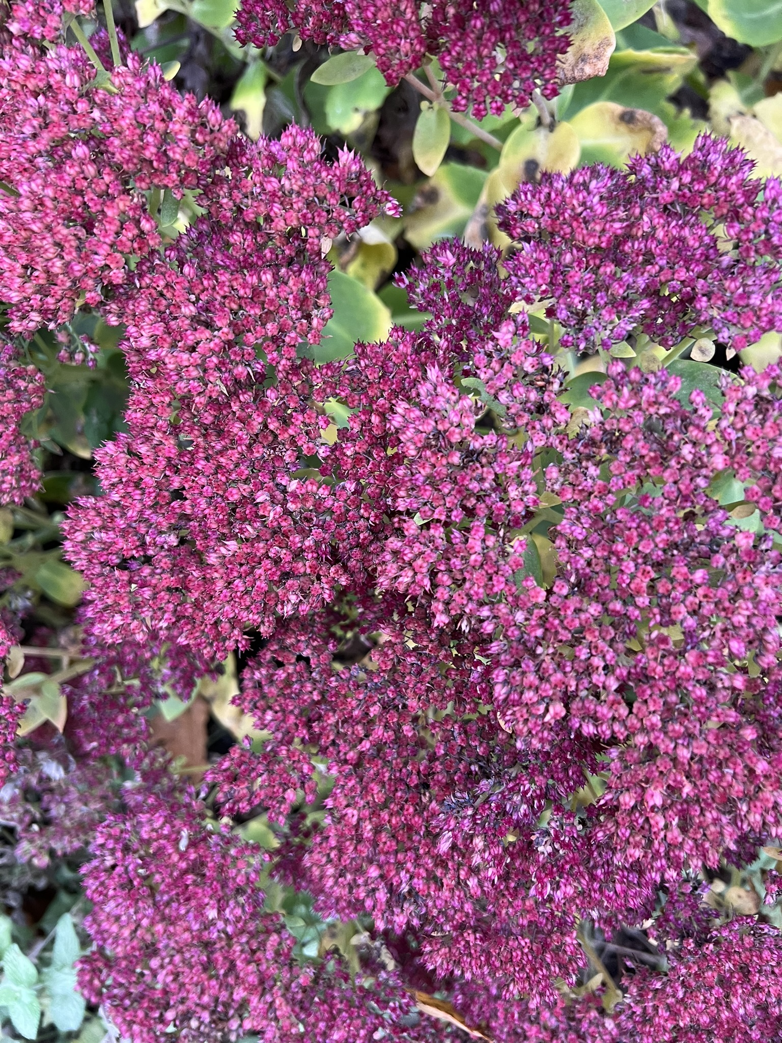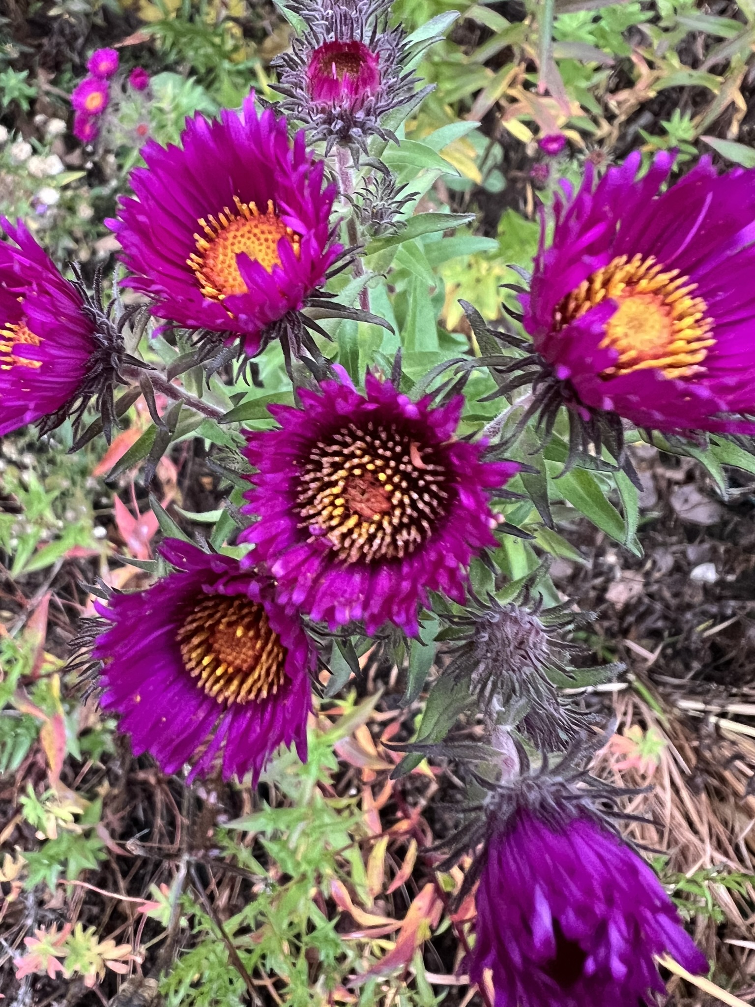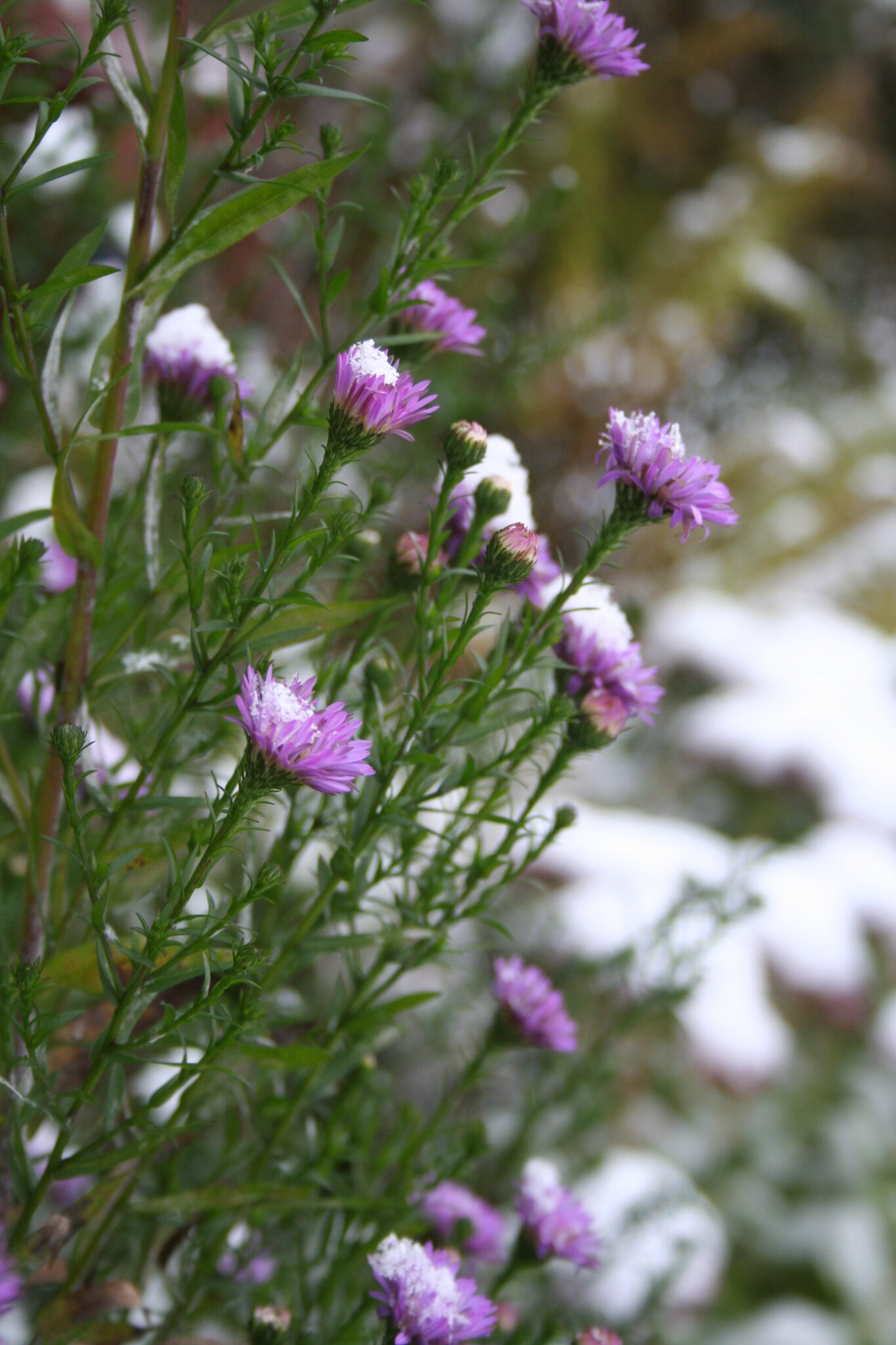 De snaste astrarna blommar fortfarande i november.Höstsedum blommar länge.Aster har fått en snöhätta i november.