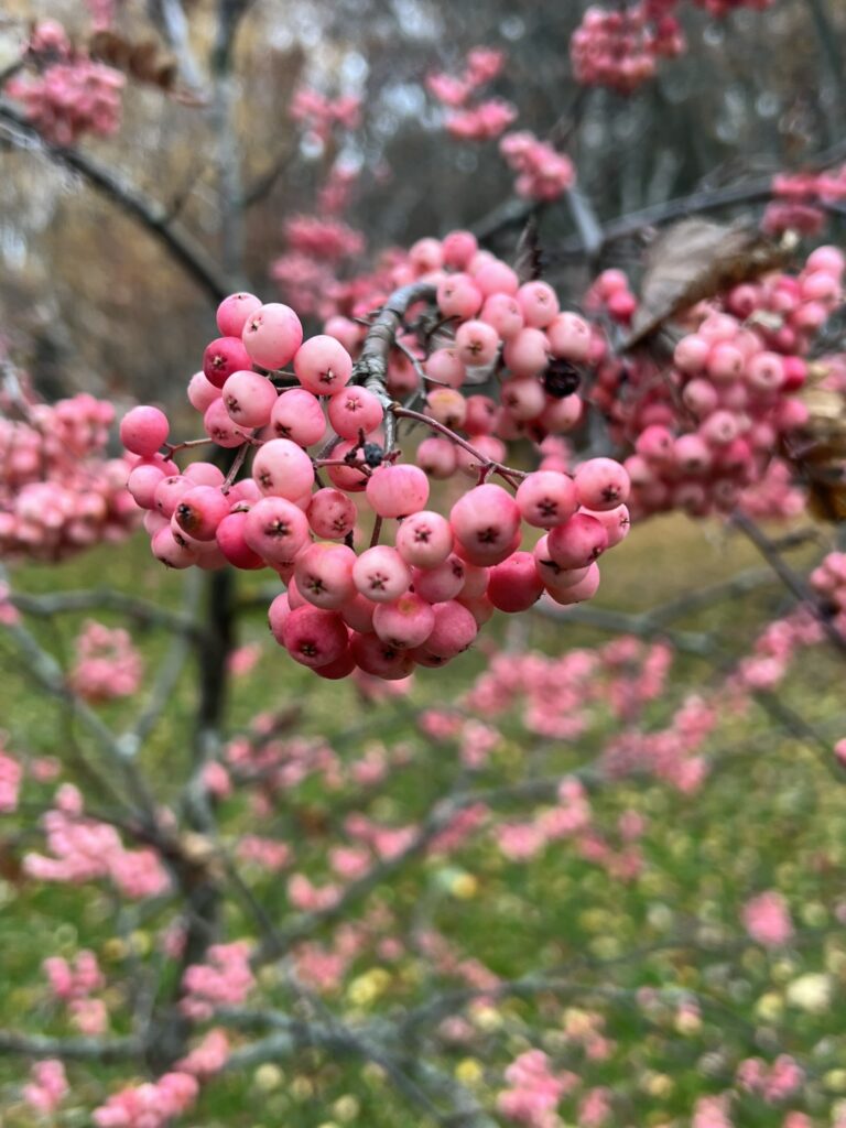 Små prydnadäpplen.Citronrönnbär ’Joseph Rock’.Rönnbäret ’Kirsten Pink’ har rosa rönnbär.