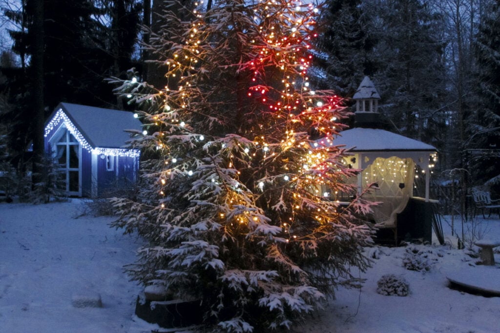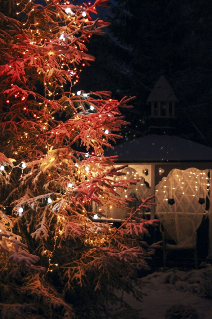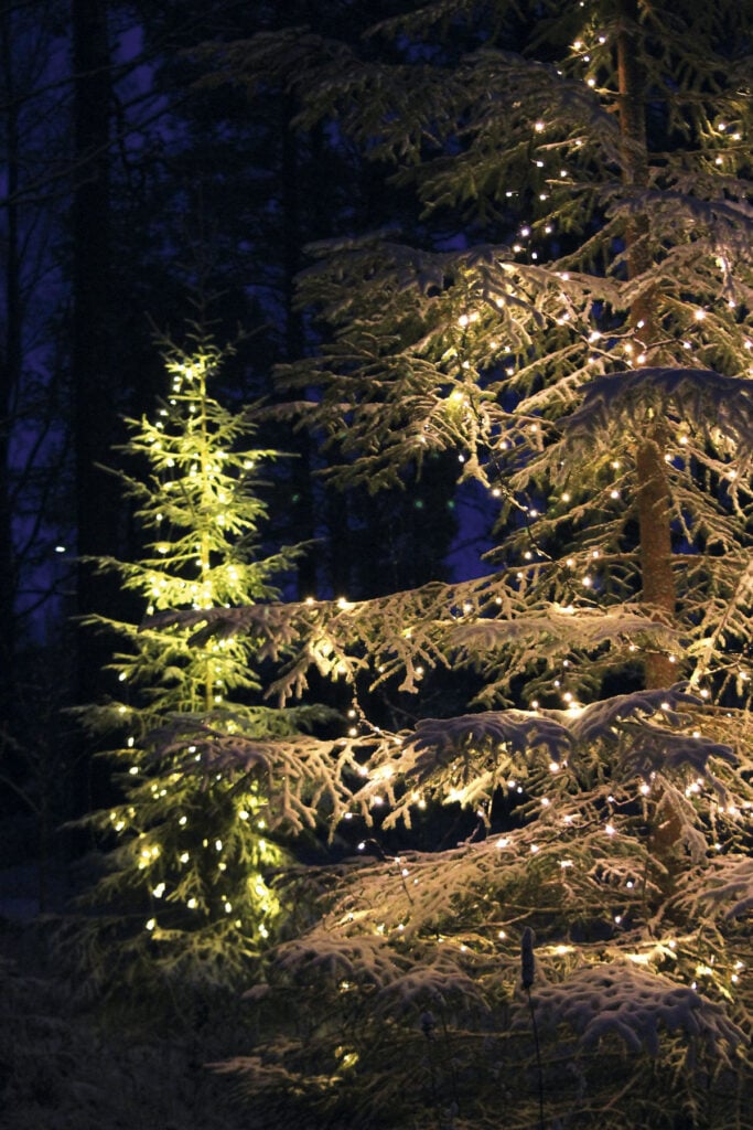 Pieniä itsestään kylväytyneitä kuusentaimia en raaski leikata pois. Ajattelen aina jouluvalojen kannalta, kuinka otollisella paikalla mikäkin kuusi mahdollisesti kasvaa ja miltä se näyttäisi täysin valaistuna vaikkapa kymmenen vuoden päästä. Kun tuhannet säihkyvät valot on viritelty, huokaan helpotuksesta – vihdoinkin valoa pimeään! Kun papat kaupan kassajonossa muikeasti hymyillen kyselevät ”Meinaatkos vielä parit jouluvalot laittaa?” ja ohi ajavat autoilijat iskevät pihani kohdalla jarrut pohjaan, tiedän että valoja on juuri sopivasti. Kun valaistu satumetsä on rakennettu ja pistoke on seinässä, tunnelma alkaa virittyä joulun odotukseen.