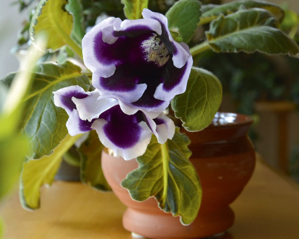 Gloksinian kukat ovat suuria, valkoisia, punaisia, sinisiä tai vaikka valkoreunaisia niin kuin tässä kuvassa.
