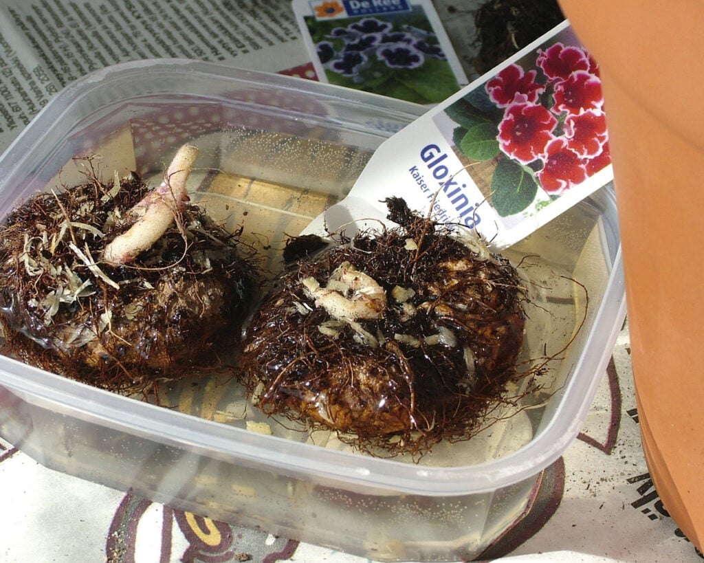 Gloksinian mukuloita kannattaa ensin liottaa vedessä varsinkin silloin, jos niissä ei näy elonmerkkiä.