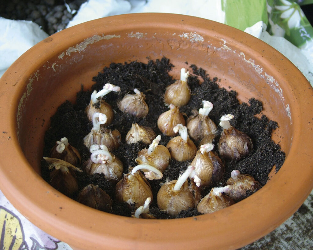 Ruukkuun asetellaan useita pieniä onnenapilan mukuloita. Multaa saa tulla päälle reilusti.