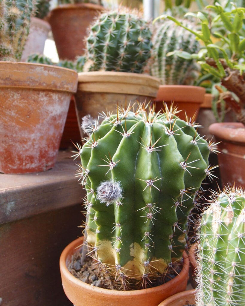 Värikkäiden perinnepelargonien lomasta pistää esiin pallokaktuksiin (Echinopsis) kuuluvia, nupulla olevia ”vanhojapoikia”. Vaaleanpunainen kukinta on ainoastaan päivän mittainen. Halonen siirtää kaktukset jo toukokuussa totuttelemaan ulkoilmaan harson alle ja kastelee niitä kesäisin runsaahkosti lannoitevedellä. Talveksi siirrytään taas minimikasteluun. Halosen kaktusten alkuperä juontuu keräilijätuttujen kokoelmiin, onpa yhdellä evakkohistoriaakin.