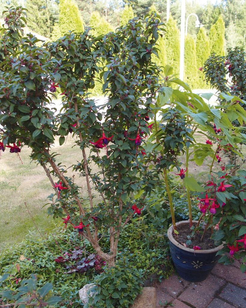 Vanhanaikaisten kasvien runsaus luo talon pihamaalle poikkeuksellisen tunnelman. Vaikkapa sisääntulon rungolliset, ikääntyneinä puumaisiksi muuttuneet 'Hilja'-verenpisarat (Fuchsia × hybrida) tuovat mieleen kartanoiden pihamailla kuvatuista mustavalkokuvista välittyvän ilmapiirin. Sitä Halonen on pitänytkin mielessään asetelmia laatiessaan. Pihatyylin lisäksi vanhojen kasvien esille laittamiseen liittyy arvostuksen osoittaminen. Olihan aiemminkin tapana asettaa huonekasveja vaikkapa valokuvapotrettiin talonväen kanssa.