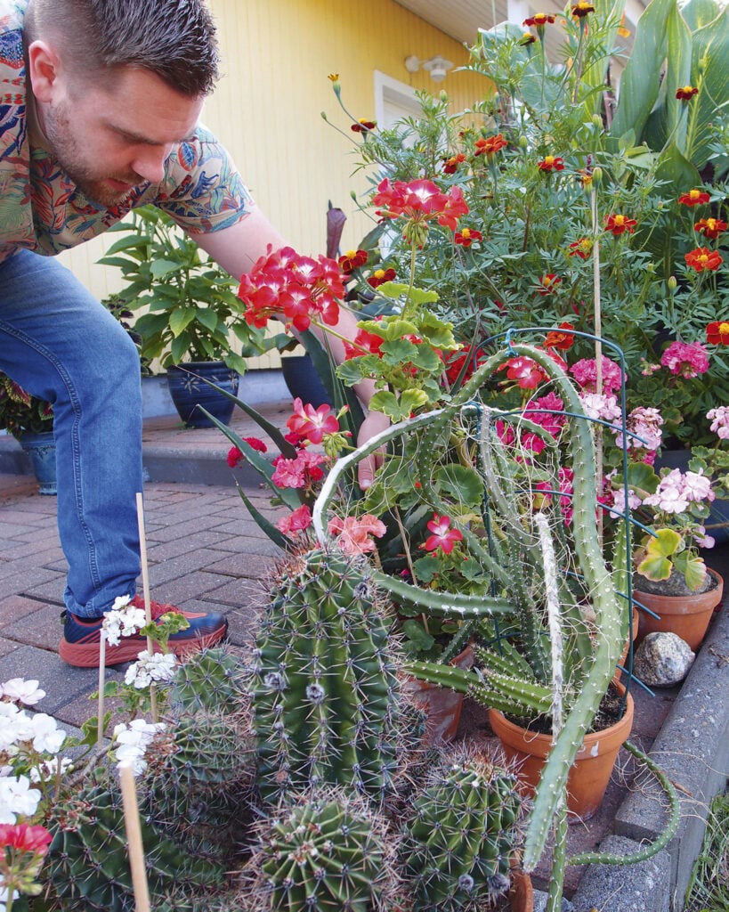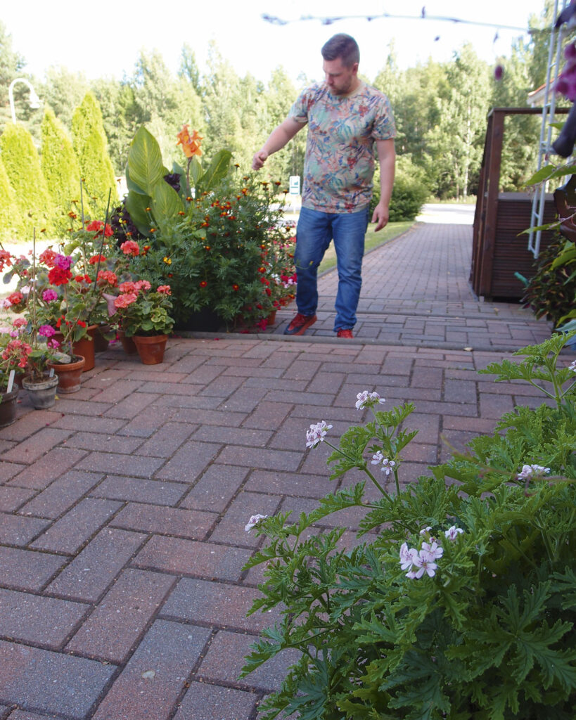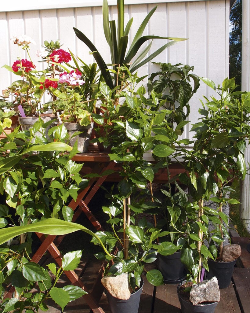 Jussi Halonen ryhmittelee kasvinsa kesäksi pääasiassa ulos. Ne koristavat pihaa kesäkukkien tapaan, kun esimerkiksi erilaisista lehtimuodoista koostaa visuaalisesti hauskoja kokonaisuuksia. Ryhmiksi aseteltuina lukuisat kasviruukut on myös helpompi kastella.