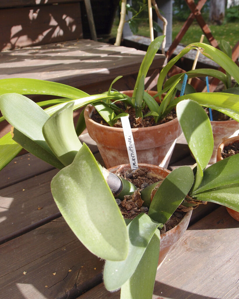 – Sen kapeat ja pitkät lehdet säilyvät vihreinä talvellakin, kun taas suurempisipulisen kapmaankriinumin (C. moorei) palmua muistuttava lehtiruusuke kuihtuu silloin ja kasvi siirretään viileään varastoon, valottaa Halonen kriinumeiden kasvukiertojen eroa.