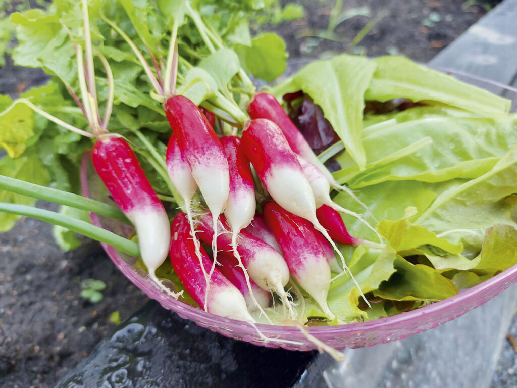Suurikokoisia 'French Breakfast' ja 'Flamboyant' -retiisilajikkeita kylvämällä saat samalta kylvöalalta tuplasadon.