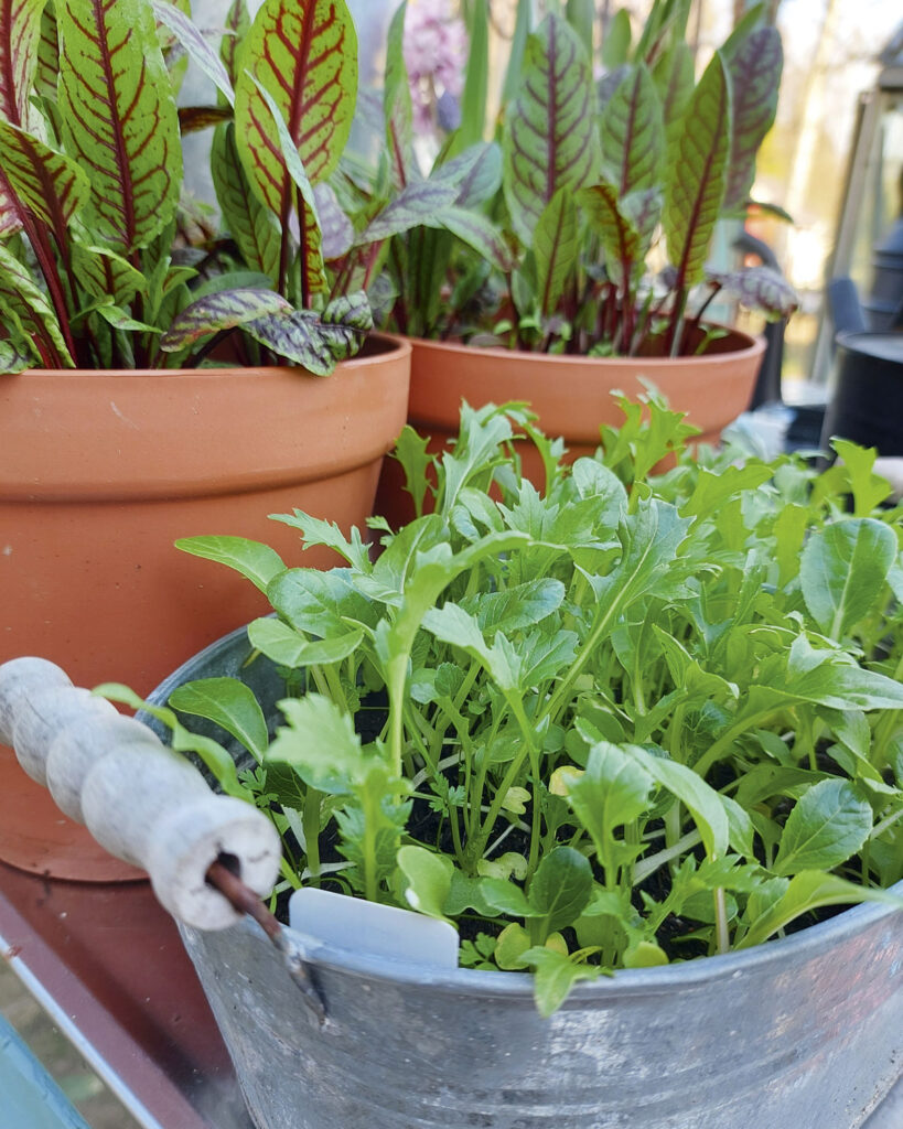 Viinisuolaheinä on kaunis lehtikasvi vaikka ruukkuun. Kun keväällä kaivaa jakopalan ja vie kasvihuoneen lämpöön, satoa saa aikaisin. Sinkkiastiassa versoo sekoitus aasialaisia salaattivihanneksia.