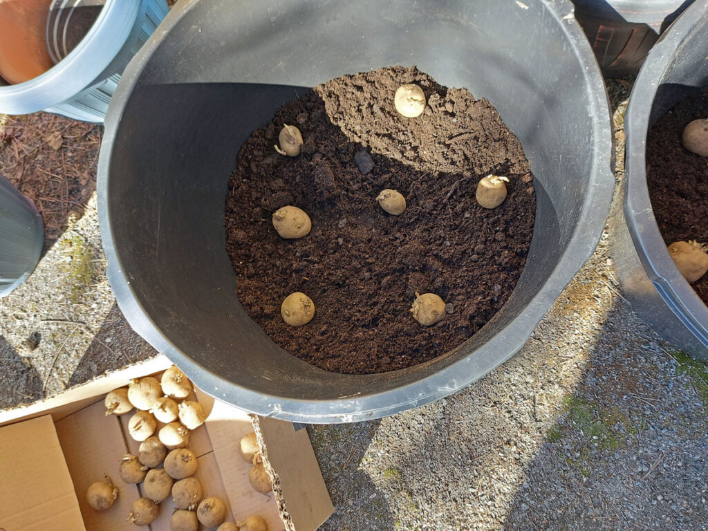Juhannusperunat itävät jo! Mustassa, tilavassa saavissa kasvihuoneen lämmössä pienimuotoinen varhaisperunatuotanto alkaa huhtikuun puolivälissä.