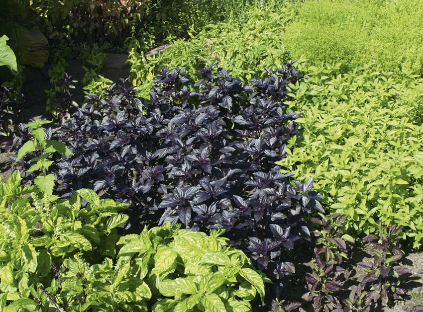 Lämpimästä kasvupaikasta pitävästä basilikasta (Ocimum basilicum) on saatavana voimakkaan punalehtisiä lajikkeita. Ne koristavat mainiosti salaatteja ja ruoka-annoksia. Myös ryytisalvian (Salvia officinalis) ’Purpurascens’-lajikkeen nuoret lehdet ovat koristeellisen punaiset.