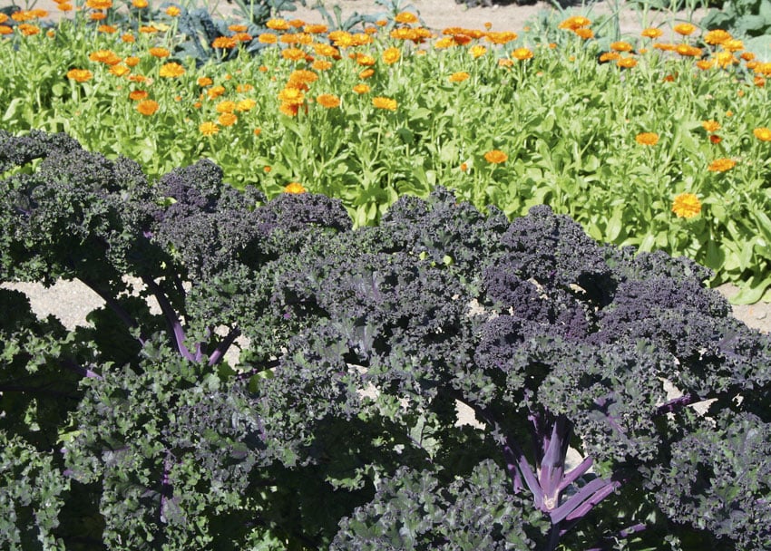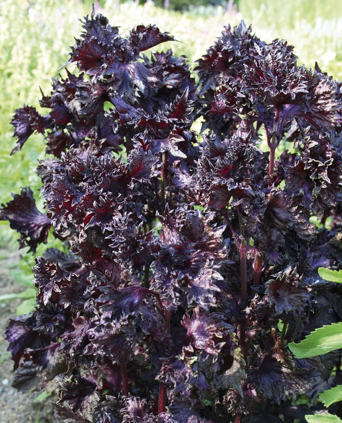 Purppuranpunalehtinen lehtikaali ’Redbor’ on kasvimaan herkku ja koristus.