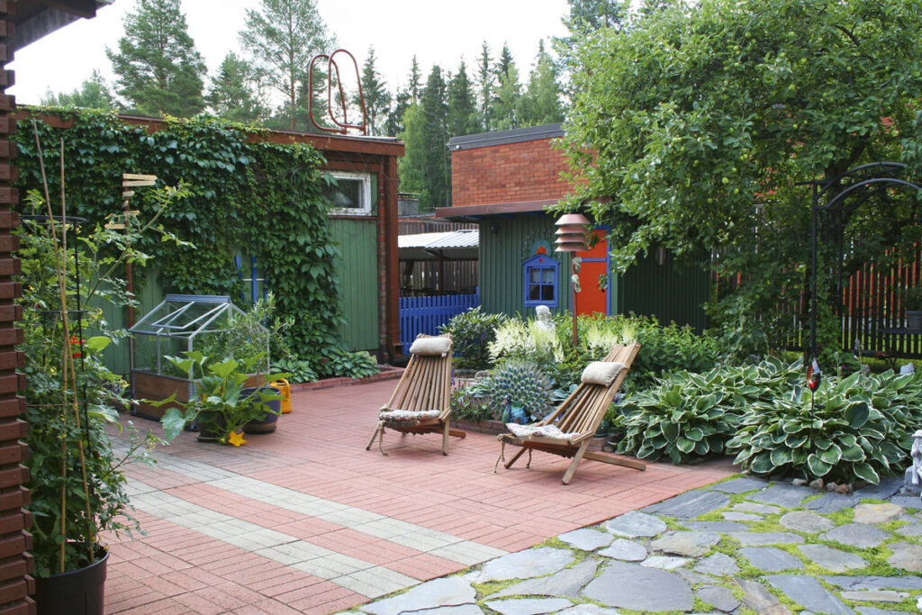 Piha-alue on muuttunut muutenkin paljon sitten Timon vanhempien. Ensimmäisenä laajennettiin liuskekivilaatoitusta ja terassia, joka sai puisen lattiapinnan ja toiseen reunaan valokatoksen. Terassilla on kannojen, ihmeköynnöksen ja tomaattien sekä istuinryhmän lisäksi Tuijan heteka. Timo puolestaan viettää öitään koiran kanssa teltassa.