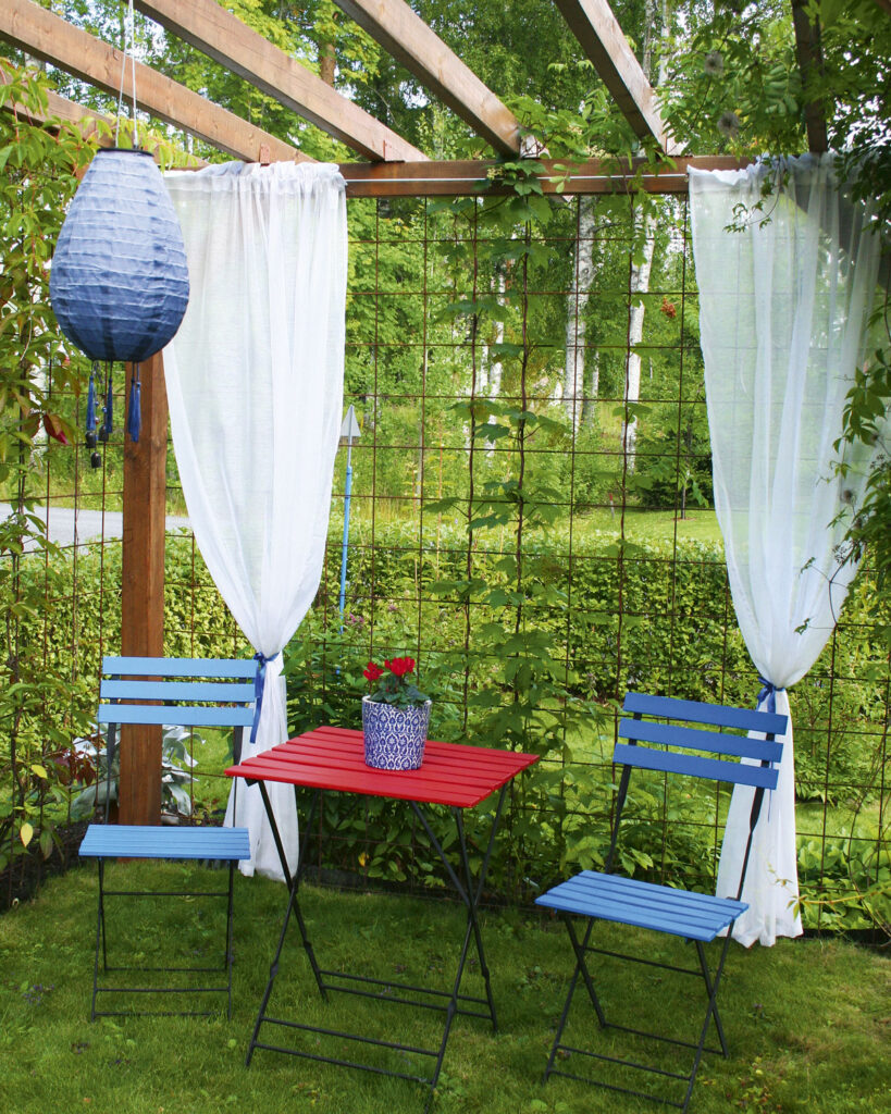 Sinivalkoruudullinen pöytäliina, siniset verhot, koristeet ja välimerelliset kasvit vievät aatokset eittämättä etelän maille. Ison omenapuun alta syreenipensaan kyljestä järjestyi puolestaan paikka pienelle sangriaterassille. Lehvästön varjossa on mukava istuskella helteisenä kesäpäivänä ja siemailla kylmiä juomia.