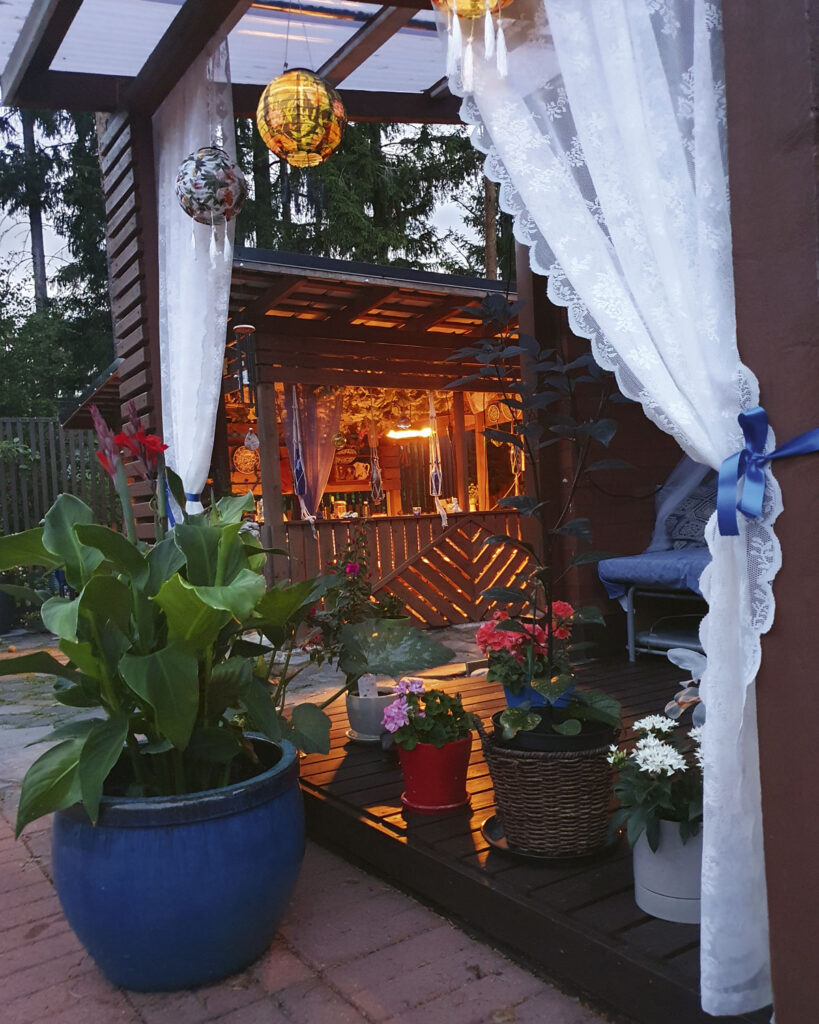 – Jostakin syntyi idea muokata grillikatoksesta kreikkalainen taverna, joka sai nimen Happy Olive. Siitä saimme kimmokkeen tehdä pihastamme ”köyhän miehen Kreikan”. Ei tarvitse välttämättä matkustaa maailmalle nauttiakseen kreikkalaisesta ruoasta ja tunnelmasta, kun siihen voi virittyä omalla pihalla, Tuija paljastaa. – Tänne on mukava kutsua myös vieraita syömään ja viihtymään.