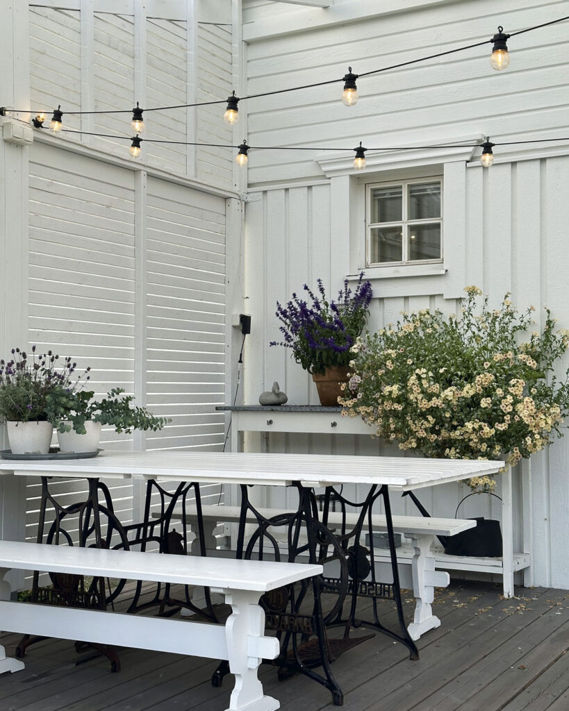 Vanhat ompelukoneen jalat ovat saaneet uuden elämän pihakalusteiden jalkoina.