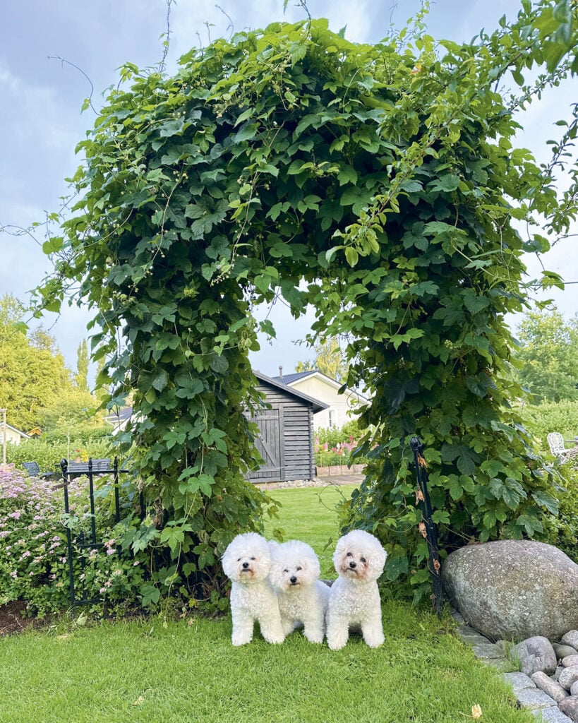 Perheen kolme bichon friséta saavat olla vapaina aidatulla pihalla.