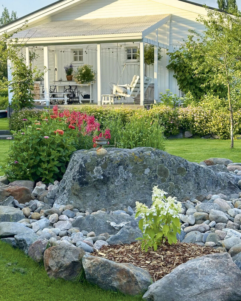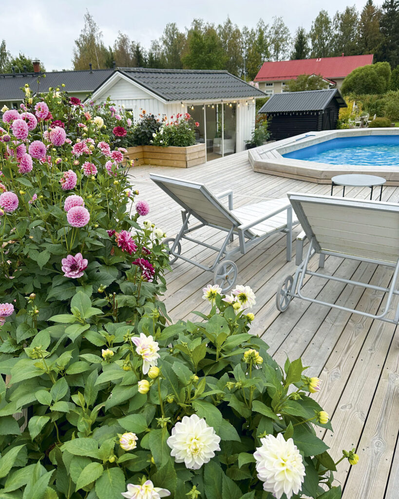 Elämäntilanteiden mukaan muuttunut pihapiiri on tänä päivänä kukoistava keidas, jossa vietetään aikaa koko suvun voimin. Daaliat ja itsekasvatetut kesäkukat viimeistelevät tuuhean aidanteen suojaaman kesäpihan.
