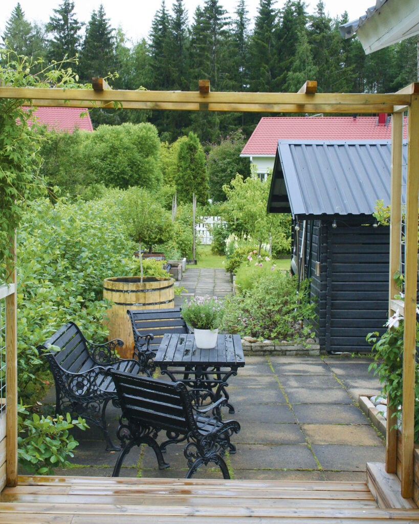 Täällä on kaikki mitä tarvitaan. Biiti ja Jukka Ylimäki viihtyvät Kokkolassa sijaitsevalla pihallaan niin hyvin, ettei heillä ole halua lähteä kauemmaksi lomallakaan. Tämä on helppo uskoa, sillä tarkkaan mietitty, viimeistelty ja vehreä piha kukoistaa. Oleskelualueet, pihahuone ja uima-allasalue porealtaineen ja ulkosuihkuineen lisäävät viihtyisyyttä ja tekevät pihasta monipuolisen kesäkeitaan. Suojaisalla ja aidatulla pihamaalla viihtyvät asukkaiden lisäksi perheen kolme koiraa. Neljällä kissalla on oma ulkoiluhäkki talon seinustalla.