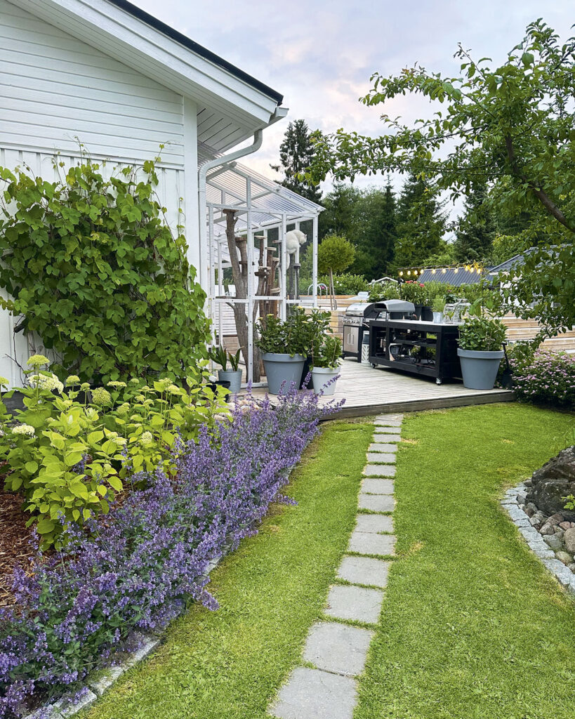 – Ruuhkavuosina emme välittäneet niinkään kukkapenkeistä, vaan lähtökohtana oli pihan helppohoitoisuus. Kun lapset lensivät pesästä, siirryttiin enemmän koristekasveihin ja muutenkin esteettisempään suuntaan. Tykkäämme molemmat laittaa, sisustaa ja suunnitella. Piha on meille kuin toinen olohuone ja sen hoito yhteinen harrastus, kertovat Biiti ja Jukka yhteen ääneen.