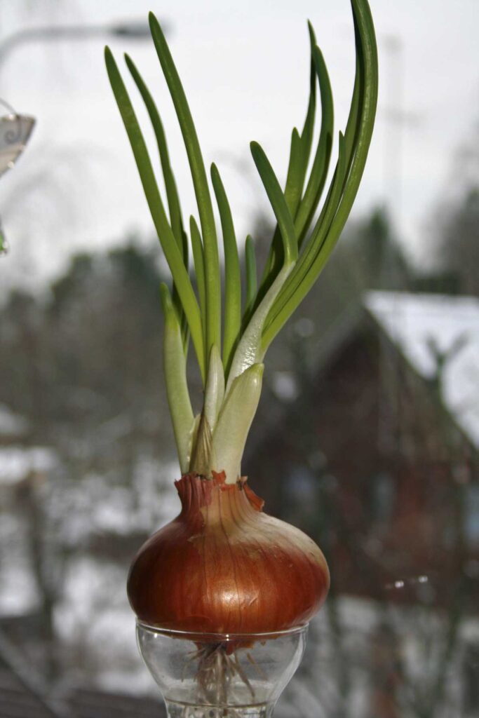 Ruokasipuli on helppo versottaa hyasinttilasissa.