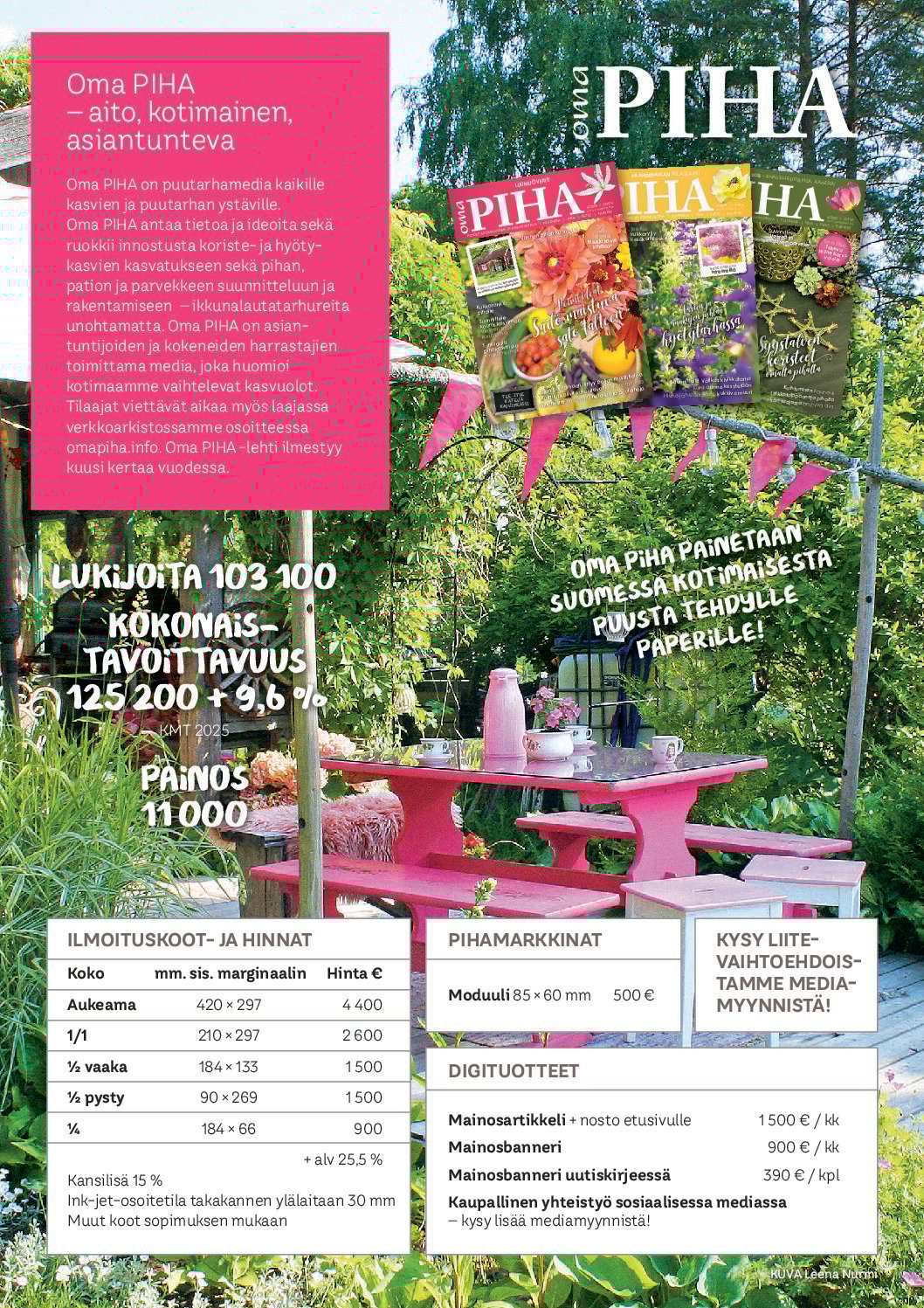 Oma PIHA on puutarhamedia kaikille kasvien ja puutarhan ystäville. Oma PIHA ruokkii unelmia sekä antaa tietoa, ideoita ja innostusta koriste- ja hyötykasvien kasvatukseen sekä pihan, pation ja parvekkeen suunnitteluun ja rakentamiseen – ikkunalautatarhureita unohtamatta. Oma PIHA on asiantuntijoiden ja kokeneiden harrastajien toimittama media, joka huomioi kotimaamme vaihtelevat kasvuolot.